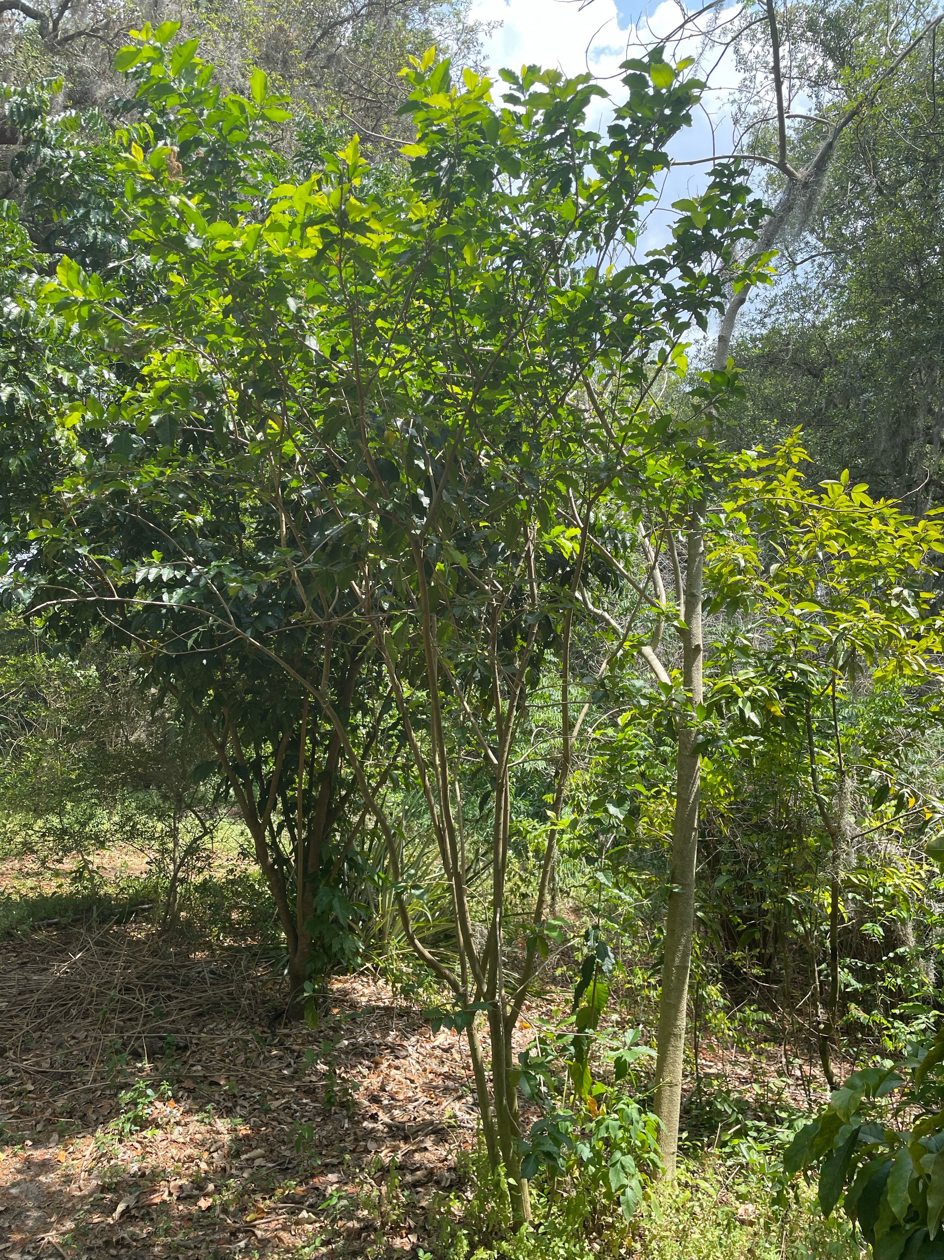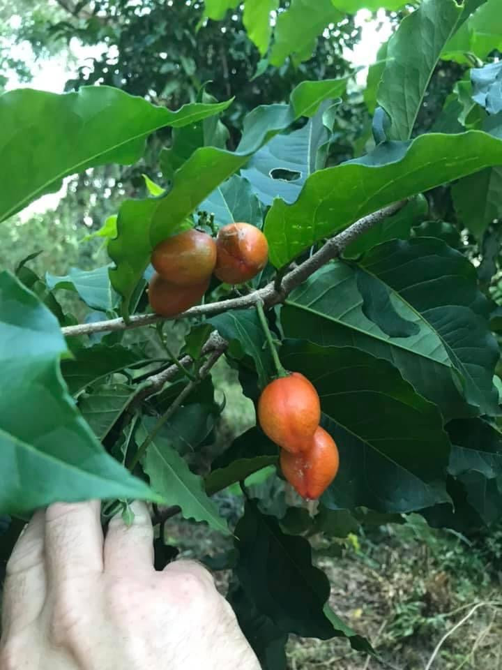 Large shrub to small tree sized exotic subtropical fruit tree with fruits flavored and textured like its namesake. Fruits ripen in small clusters to deep translucent red at this stage they are the sweetest and have a sticky dried fruit/peanut butter flavor and texture. When eaten at the orange/unripe stage they very much have the flavor of a sweet cooked carrot. Definitely a conversation tree to have in the collection. Will damage at temperatures in the mid to high 20s, but is root hardy and will rapidly grow back to small shrub size and fruit in the summer following hard freeze damage if grown in marginal climates. Can also be container grown easily for those renting or in apartments. Fruiting season is sporadic over the warmer months but generally has a heavy 1-2 month long season in the summer to early fall- we consider this an excellent yard snack due to its long consistent harvest instead of ripening many fruits at once- plant it in an area you walk by regularly while working in your food forest. Appreciates some shade but will also be productive in full sun. Good to tuck in between other larger tree species.